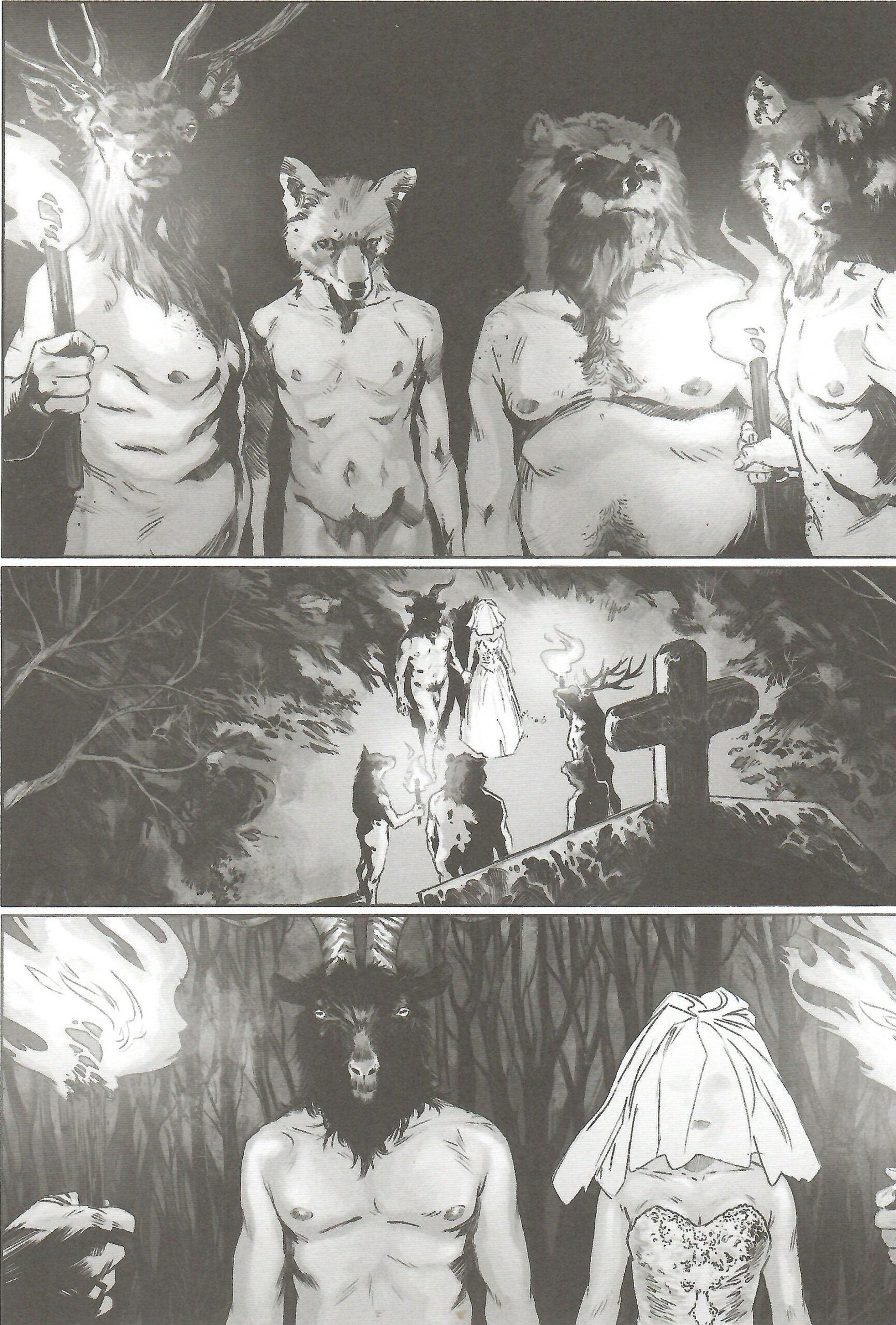 Après avoir perdu l’animal de vue, elle découvre un être étrange : un homme nu à tête de bouc, assis près du corps du chien, victime de meurtre.